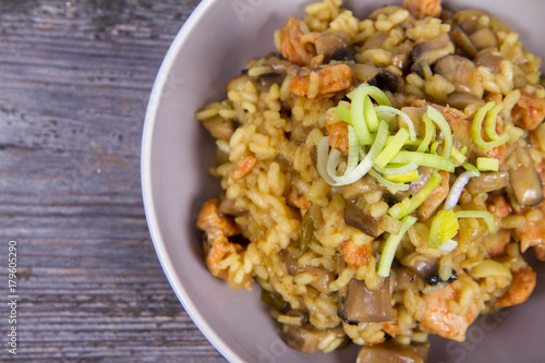 Risotto with mushrooms and chicken decorated with leek on a wooden background