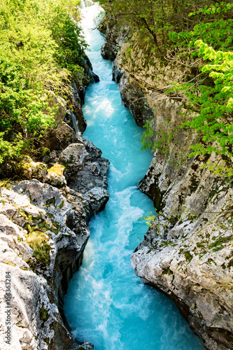 River Soca entering the narrow part of the stream and getting fast
