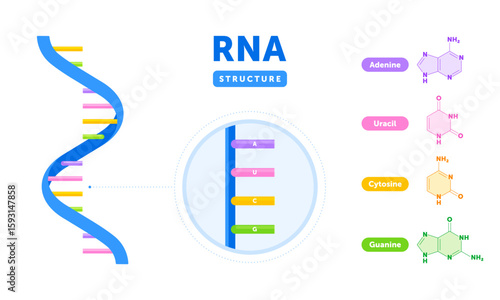 RNA strand, nucleotide bases (adenine, uracil, cytosine, guanine) and their chemical structures. Science, biology and genetics concept. Flat infographic isolated on white