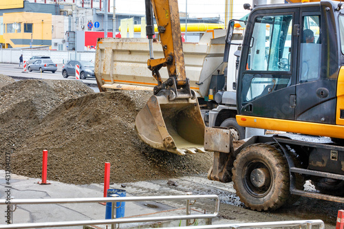 Road excavator works on the sidewalk and loads sand onto the truck.