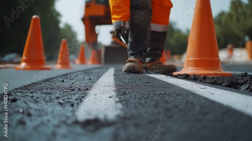 Road worker applying road markings at a construction zone. Featuring technique and precision