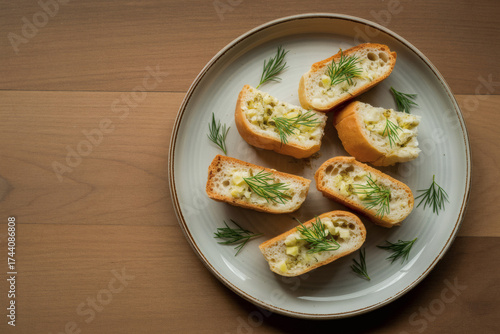 roasted bread with garlic butter and dill herbs arranged on plate, top-down view, weathered wood backdrop, rustic food photography