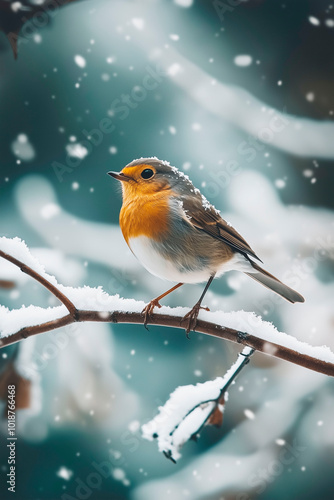 Robin perched on a snow-covered branch, with delicate snowflakes falling around in a peaceful winter setting