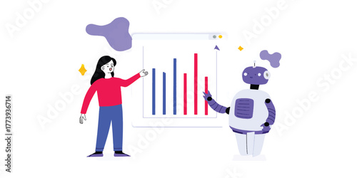 Robot and Woman Analyzing Data on a Digital Screen