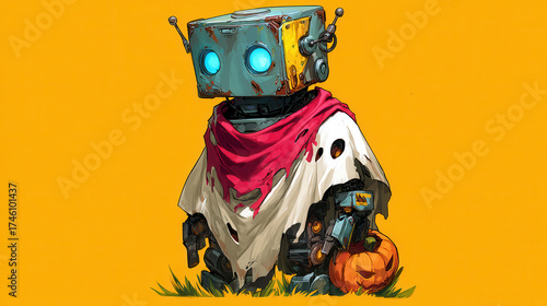 Robot dressed in ghost costume stands proudly with pumpkin, embodying spirit of trick or treat. This playful scene captures Halloween joy