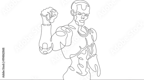 Robot with raised arm. Clenched fist of mechanical man. Robot android gesture of victory and fight. One continuous line. Line art. Minimum one line. White background. One line drawing.