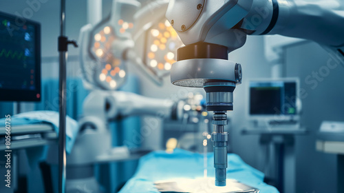 Robotic arm performing delicate surgery, advanced technology, Clinical and sterile environment