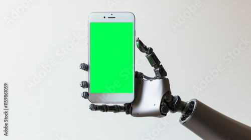 Robotic_Hand_Holding_Smartphone_with_Green_Screen_on_White_Background