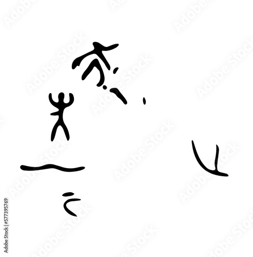 Rock petroglyphs depicting a snake attack on a life or pasture and people. Vector illustration of prehistoric rock petroglyphs discovered on the territory of Armenia
