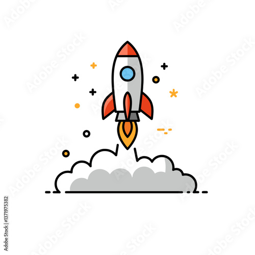 Rocket launching with flames against a cloud background