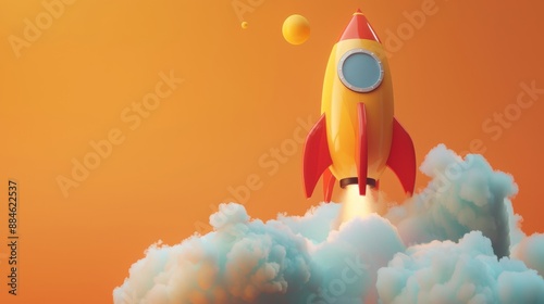 Rocket toy spews smoke, symbolizing startup, space, and business concepts. Rendered in 3D vector with cartoonish minimalism.