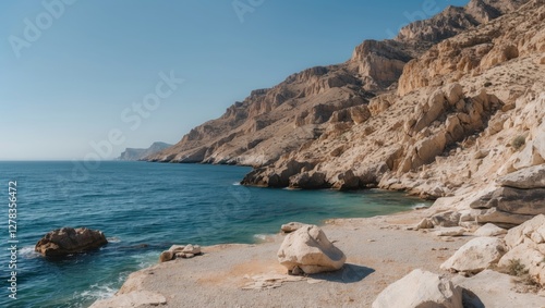 Rocky Coastal Landscape by the Mediterranean Sea Under Clear Blue Skies with Calm Waters and Space for Text or Design Elements