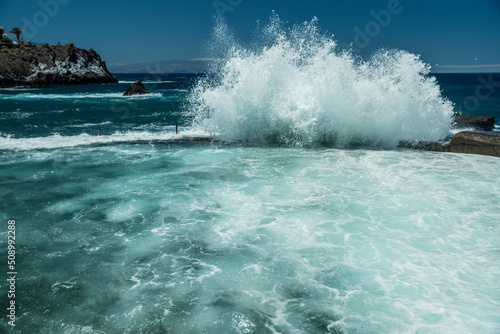 Rocky coastline and big wave breaking on natural swimming pool of Tenerife Island.