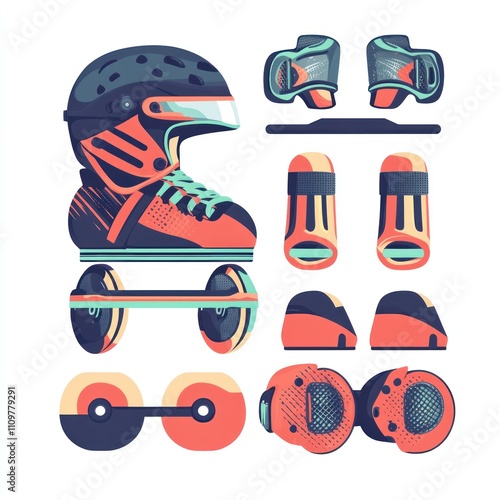 Roller skate gear helmet, pads, skates, wheels.