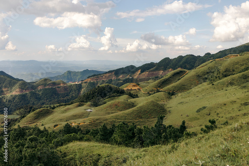 Rolling green hills under a cloud-speckled sky with distant mountains and valleys. Loc BÏnh District, Lang Son, Vietnam