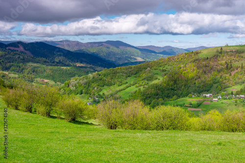 rolling hills and grassy meadows of mountainous countryside. beautiful rural landscape in springtime. sunny weather with clouds on the sky. ridge in the distance