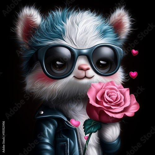 Romantic alpaca in leather jacket and sunglasses with floating hearts. Fashionable cartoon animal with rose. Valentines day or anniversary concept