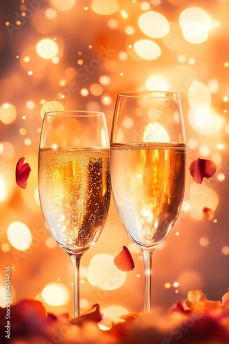 Romantic Celebration Background, Champagne Glasses With Bokeh And Petals, Dedicated Text Area