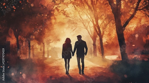 Romantic Couple Walking in Park Watercolor Illustration