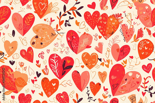 Romantic pattern featuring red and orange hearts and decorative elements on a light background. This seamless tile design is perfect for Valentine's Day or love-themed projects, adding