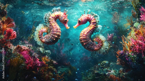Romantic seahorses floating in coral