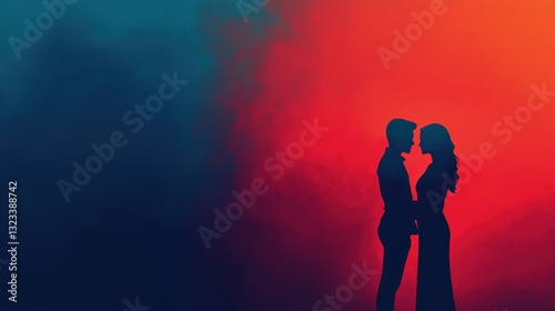 Romantic Silhouette of a Couple Embracing Against a Dramatic Colorful Background in Blue and Orange Tones, Capturing the Essence of Love and Connection