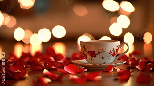 Romantic Teacup Surrounded by Red Petals and Soft Bokeh Lights