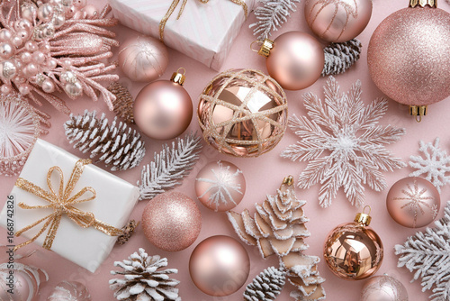Rose gold Christmas ornaments gifts and decorations on pink background