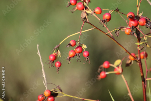Rose hip berries on a bare branch