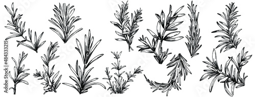 Rosemary branches and leaves isolated Vector hand drawn Sketch. Food illustration. Vintage style. The best for design logo, menu, label, icon, stamp.