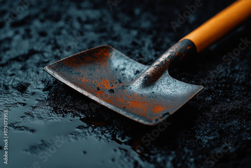 Rostige Schaufel liegt auf glitschigem Boden nach Regen
