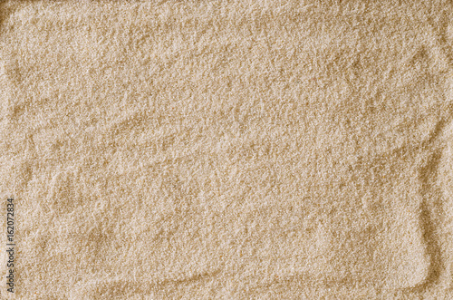 Rough and uneven empty sand surface to use as a background or texture. Light brown and ocher colored grains of sand. Macro photo close up from above.