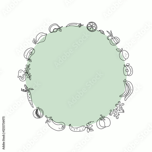 Round frame, border with a set of vegetables, fruits. World Food Day. Line drawing. Food vegetarian organic. Outline drawings. Isolated background.