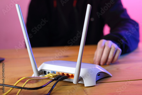 router with connected ethernet cables on table