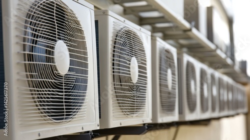 Row of Air Conditioning Units on a Building Exterior in Bright Daylight Setting