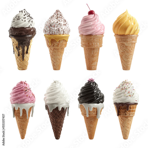 Row of ice cream cones with different flavors and toppings. isolated-on-ransparent-3d-background