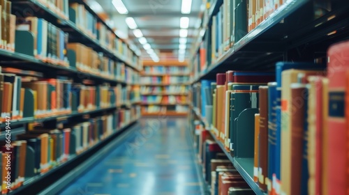 Rows of bookshelves filled with colorful books in a library, showcasing a large collection of knowledge and literature. Concept of education, research, and learning.