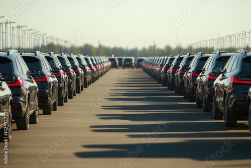 Rows of parked dark vehicles, likely SUVs, in an automotive manufacturing or distribution center