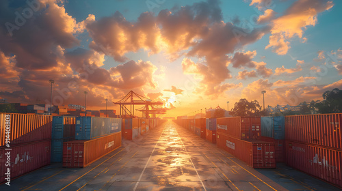 Rows of shipping containers at sunset with a crane in the background.