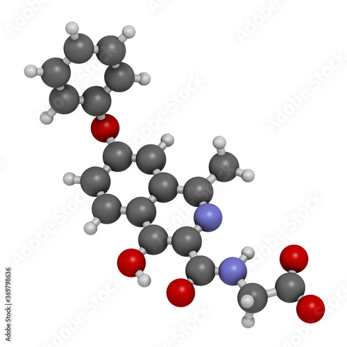 Roxadustat drug molecule. 3D rendering. Atoms are represented as spheres with conventional color coding: hydrogen (white), carbon (grey), nitrogen (blue), oxygen (red).