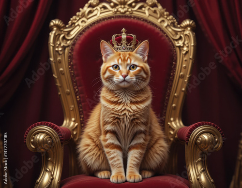Royal Cat Portrait: Orange Tabby with Crown on Golden Throne
