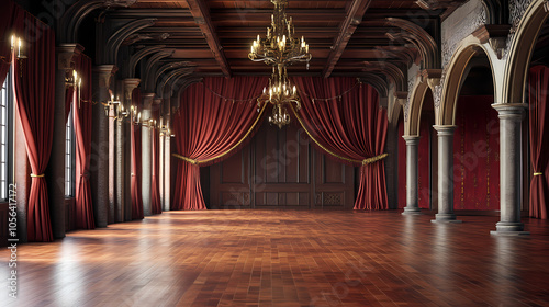 Royal medieval castle's ballroom with curtains. Medieval Banquet Hall. Illustration