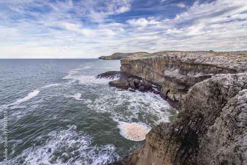 Rugged shore of Ajo cape over Bay of Biscay of the northeast Atlantic Ocean in Cantabria, Spain