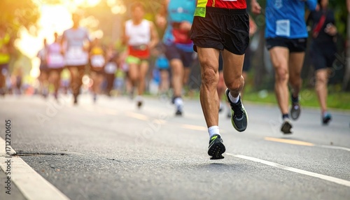 Runners in a Marathon Race on the Asphalt Roadway During a Sunny Day Blurred Background of Trees People and Sunlight