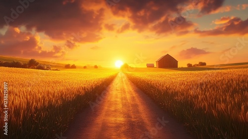 rural dirt road bordered by golden wheat fields, stretching toward a distant barn under a glowing sunset.