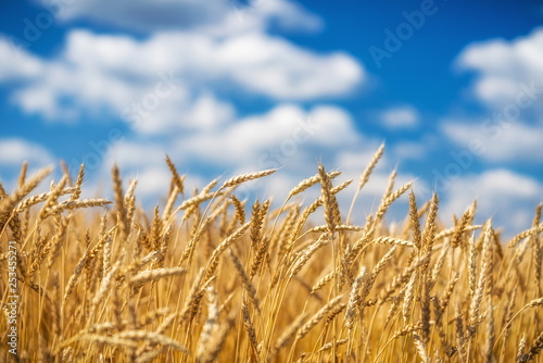 Rural landscape with golden wheat field over blue sky at sunny day.