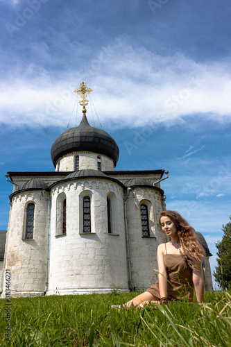Russia, Yuryev-Polsky. Beautiful girl tourist visits the sights.