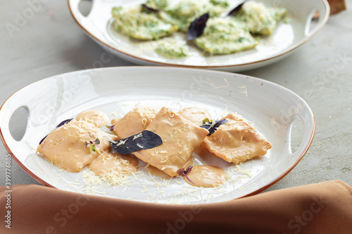 Russian dumplings with parsley and mushroom sauce served in two plates