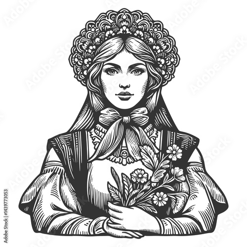Russian woman in detailed folk costume and headscarve, Slavic heritage and cultural beauty in vintage style sketch engraving generative ai raster illustration. Scratch board. Black and white.