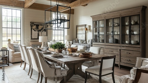 Rustic Farmhouse Dining Room with Wooden Beams and a Chandelier